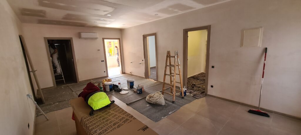 Realicemos un enmasillado previo de golpes, roces y fisuras para garantizar un acabado perfecto. Esta parte es muy importante realizarla antes de pintar ya que garantizamos que las paredes, una vez pintadas, queden perfectas.
